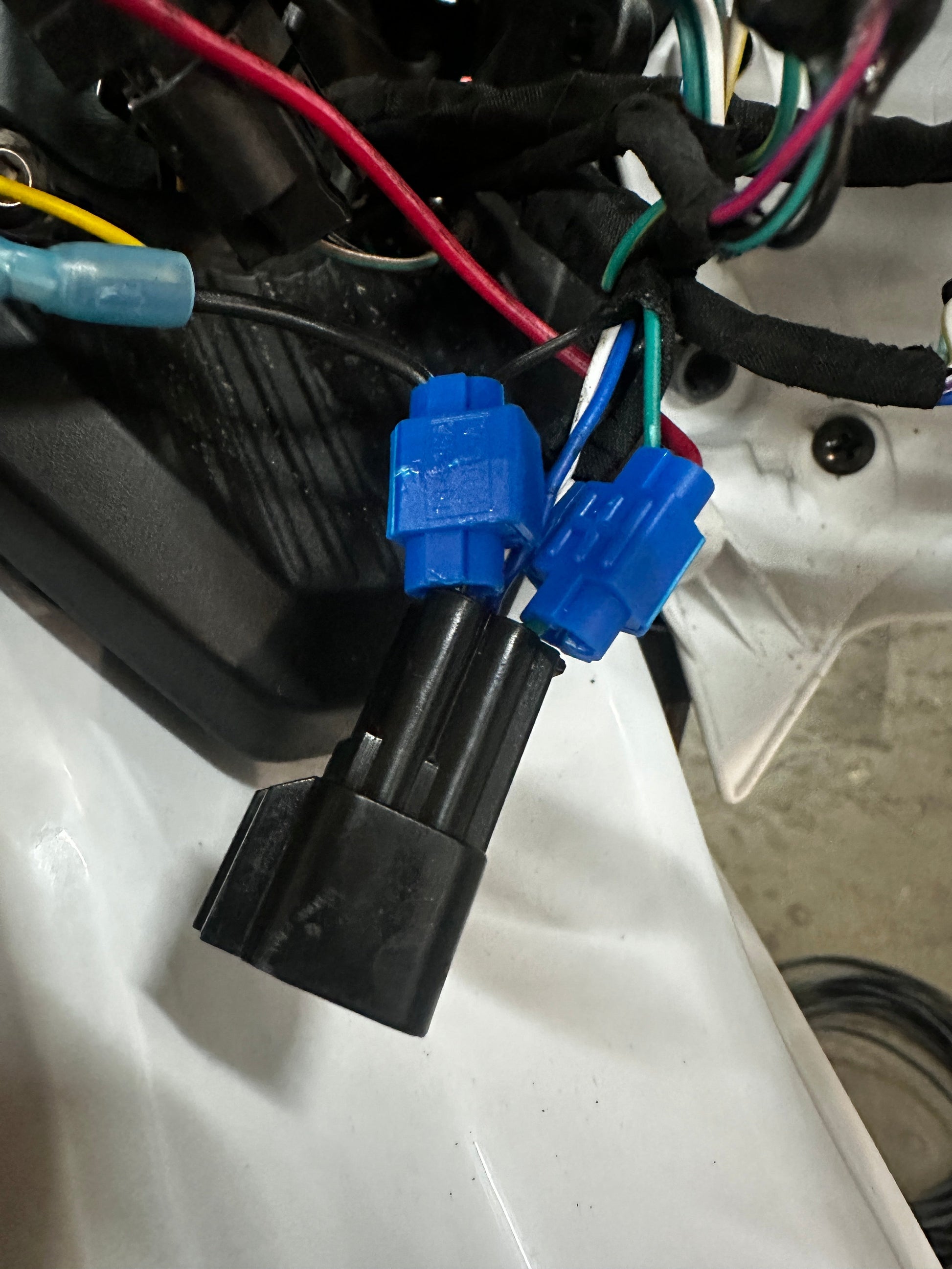 Connect the single strand yellow wire from the harness that's also connected to the yellow wire of the main harness, to the black wire on the headlight plug.
