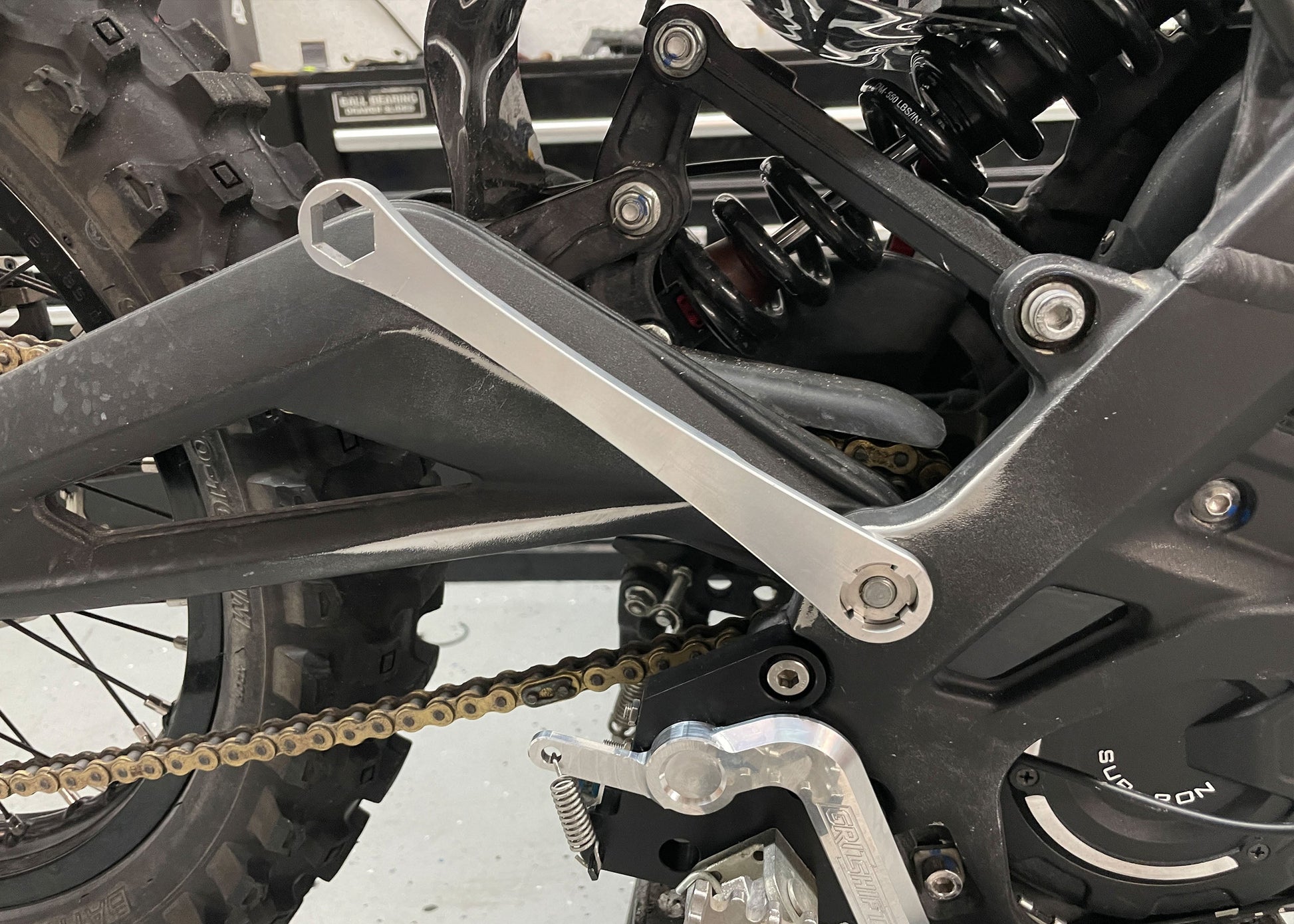 - On the other: a four-pin wrench to remove the swing arm nut